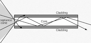 Partendo da sinistra vediamo le quattro linee dati che entrano nel chip nero di controllo dei laser, i quattro componenti verdi. Appena dopo si riconoscono quattro lenti di focalizzazione (grigie) e una singola lente di focalizzazione viola-azzurra. Le parti ottiche trasparenti con delle sbarre sono dei prismi che servono a convogliare i quattro laser su un unico punto di uscita.
